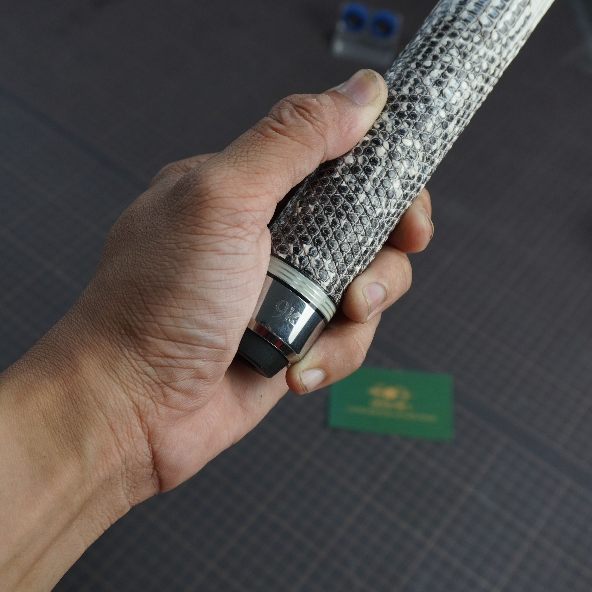 Bọc cơ da kì đà màu trắng đen cho chuôi Custom, với chất da kì đà trắng đen thể hiện sự huyền bí