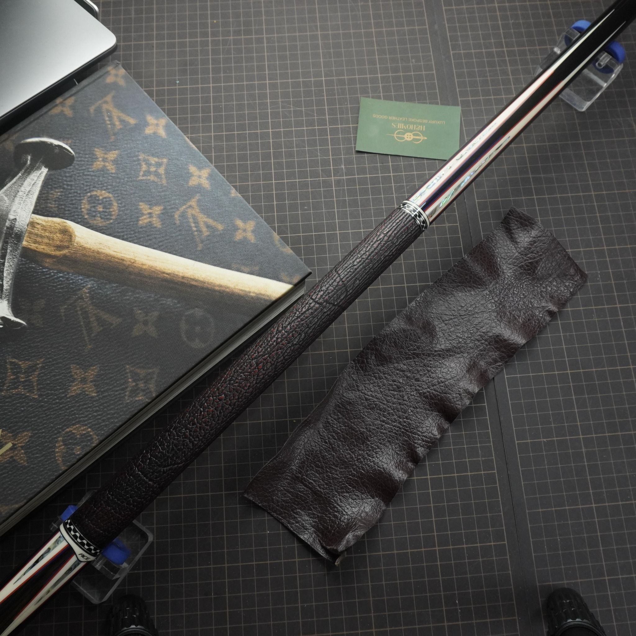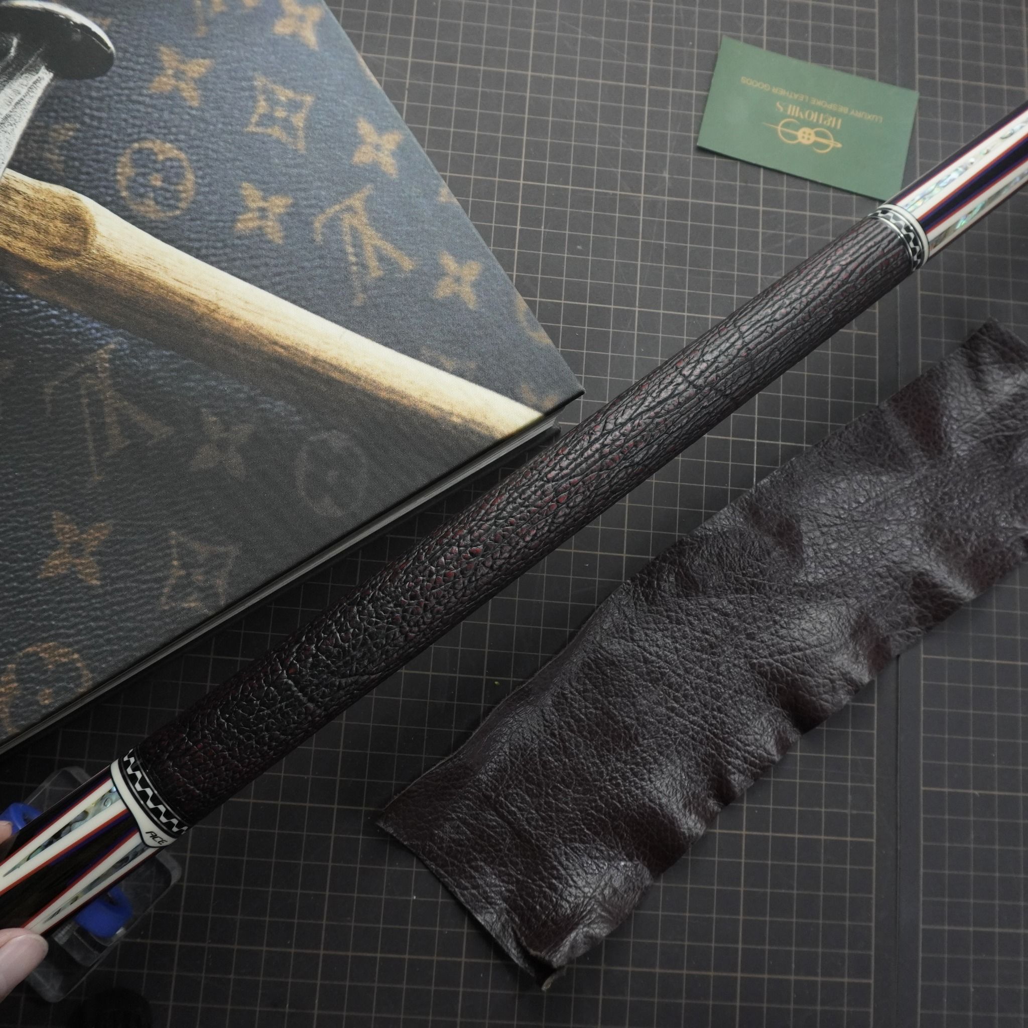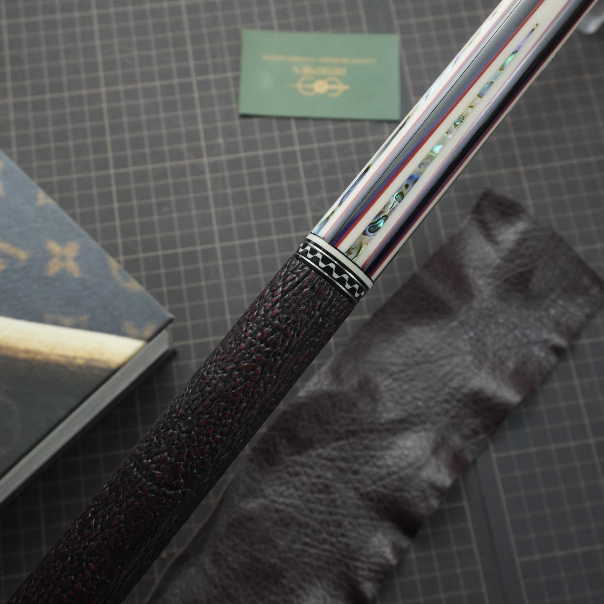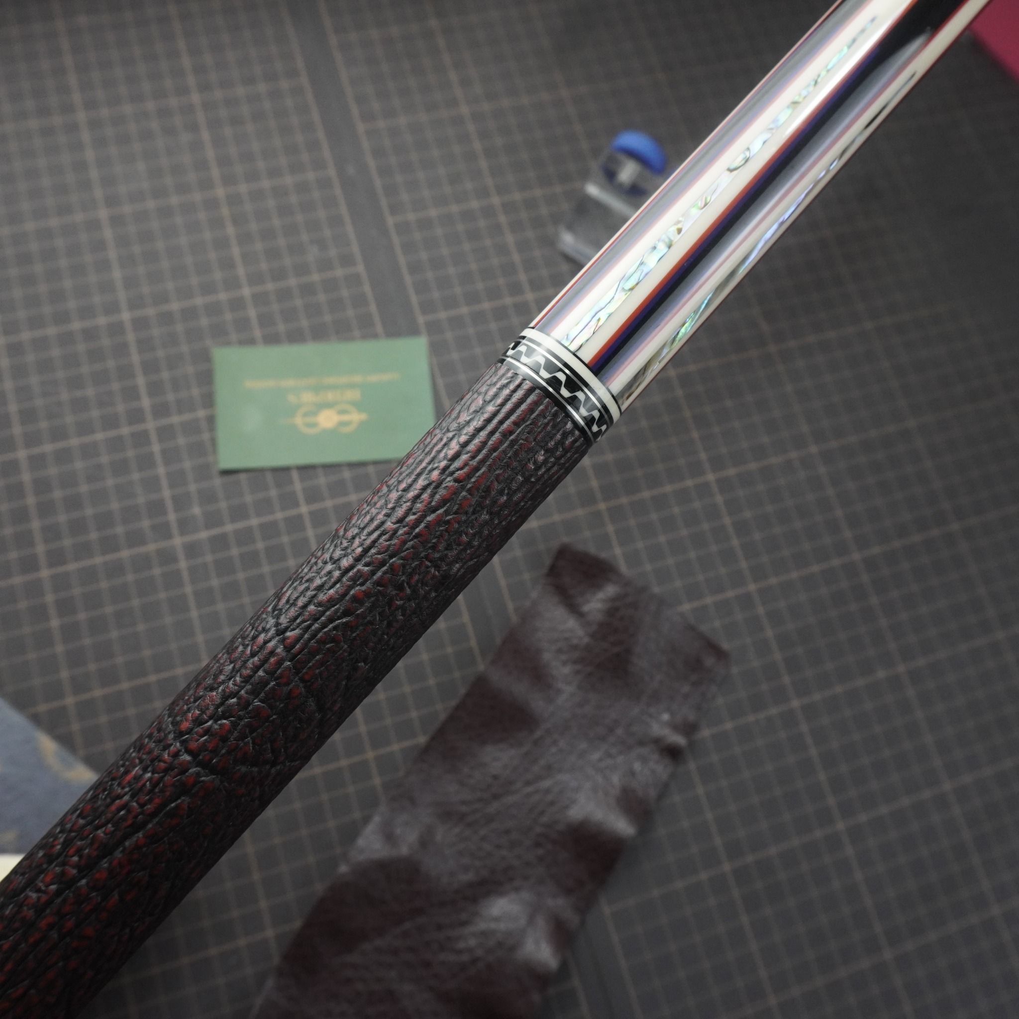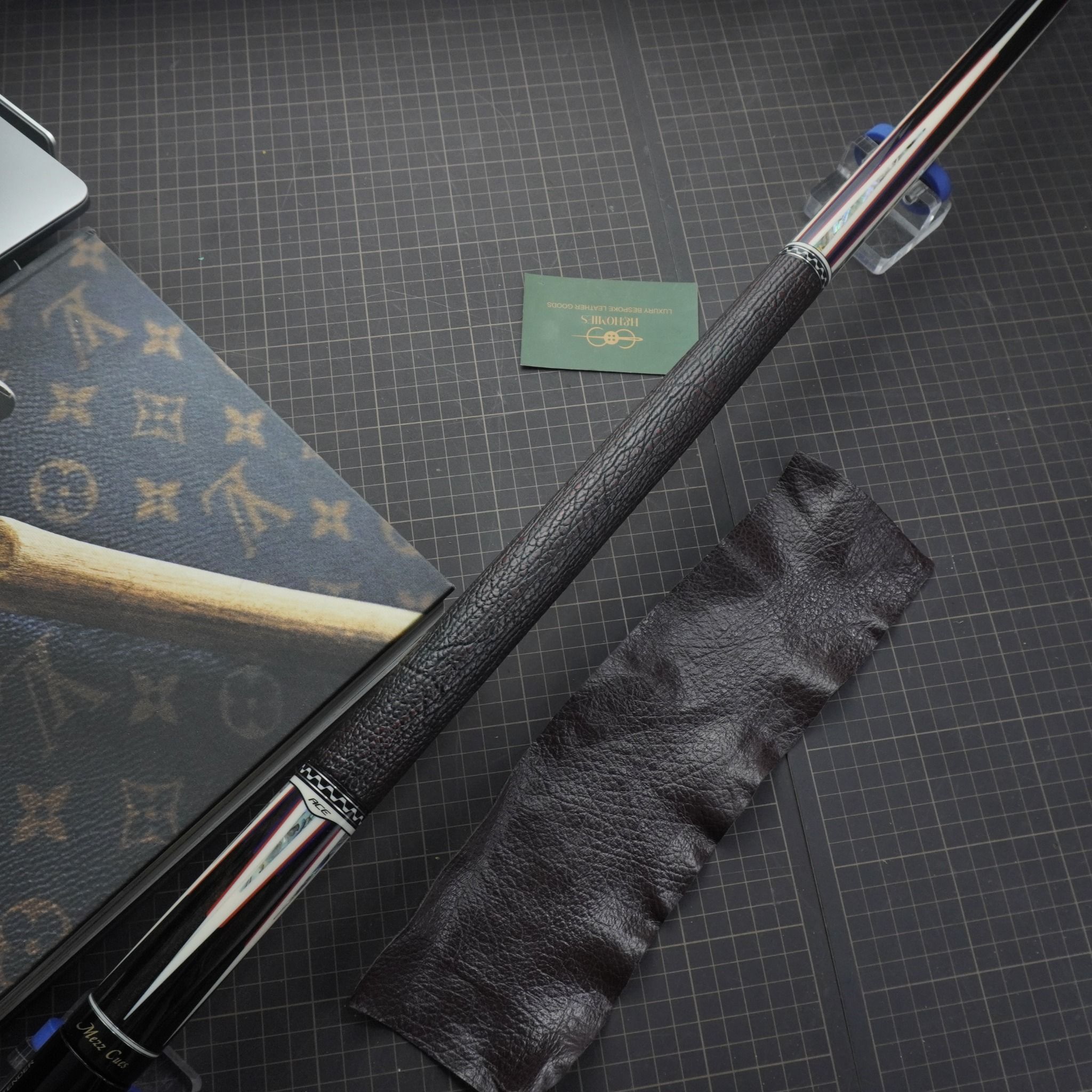Bọc cơ da cá mập màu nâu cho chuôi Mezz Cues với chất da sát thủ đại dương tạo cảm giác an toàn và bền bỉ khi sử dụng