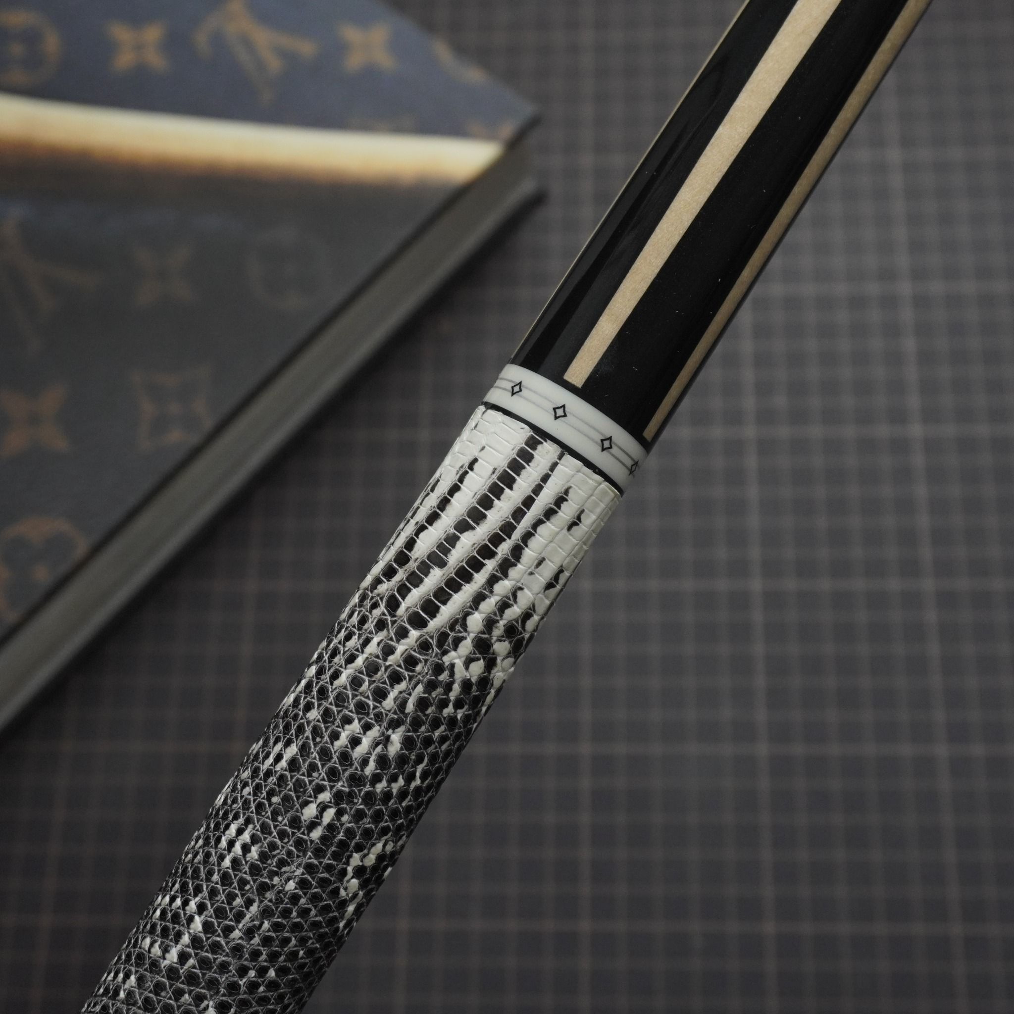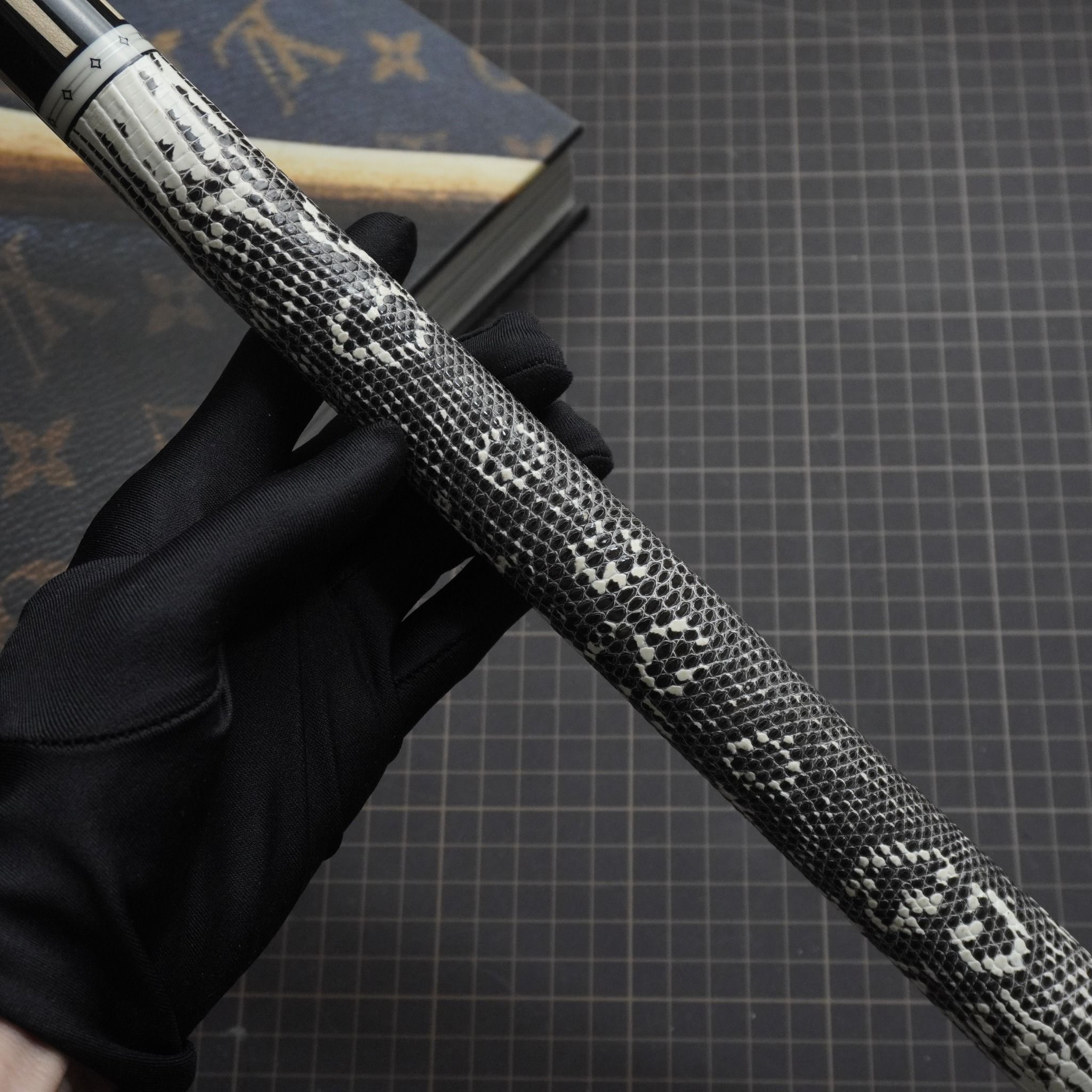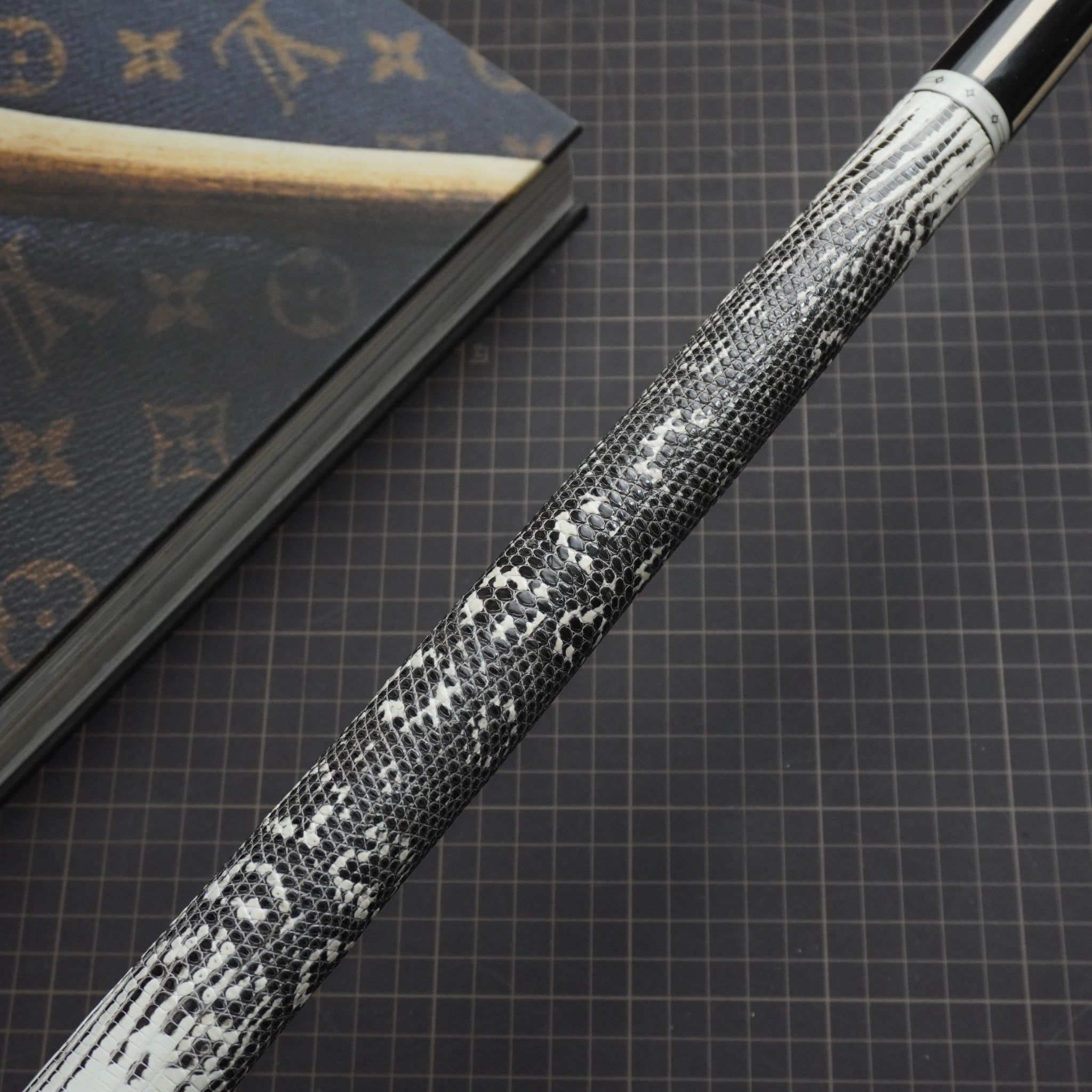 Bọc cơ da kì đà màu trắng đen cho chuôi MIT với những chiếc hoa văn tự nhiên tạo nên phần độc lạ và nét quyến rũ của các cơ thủ