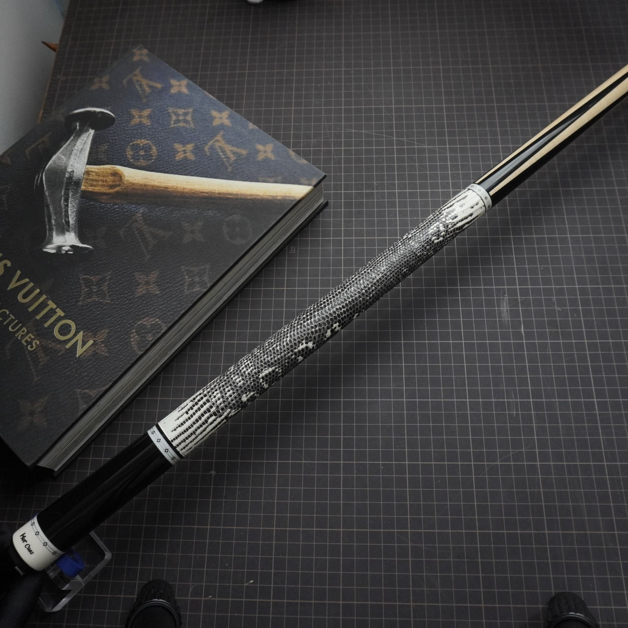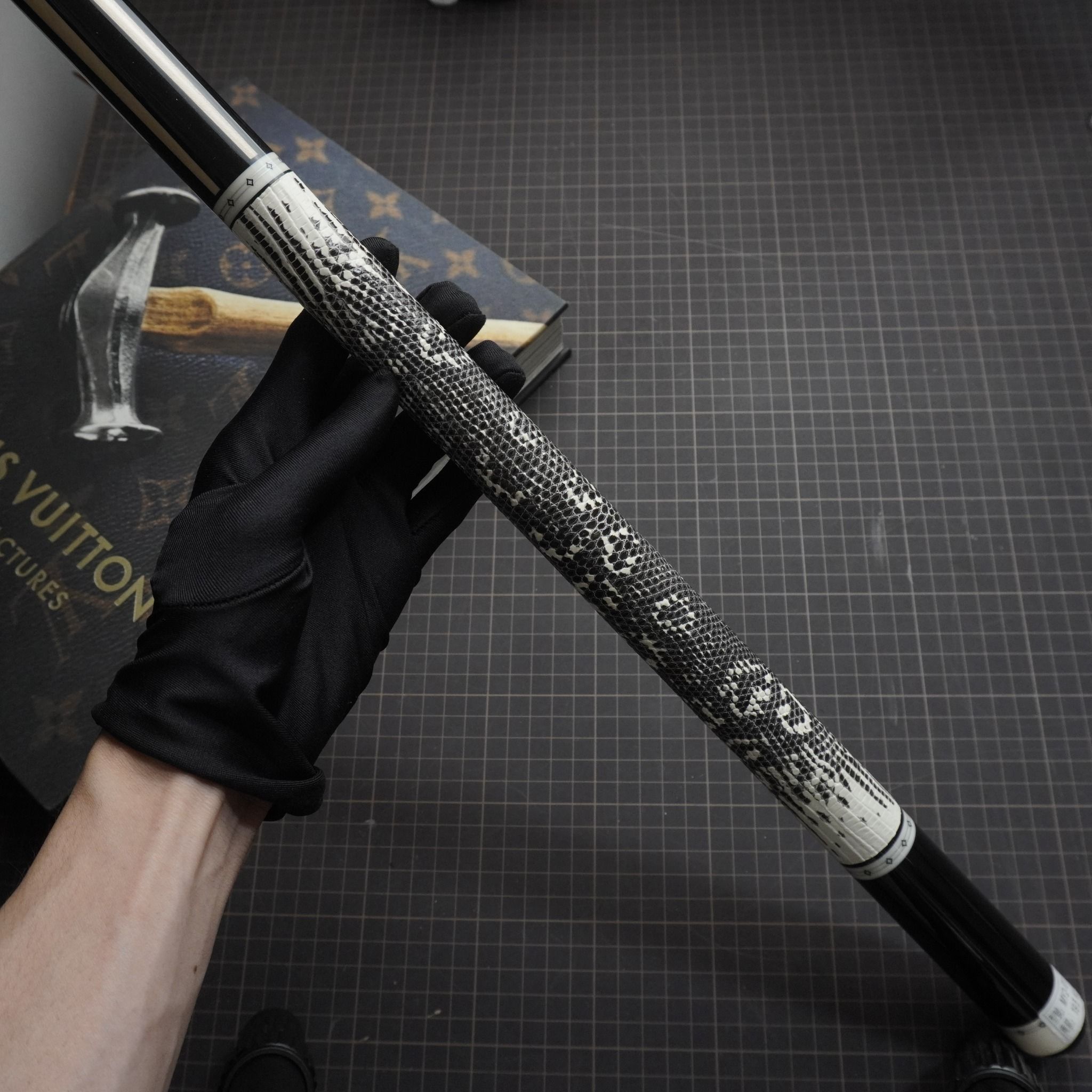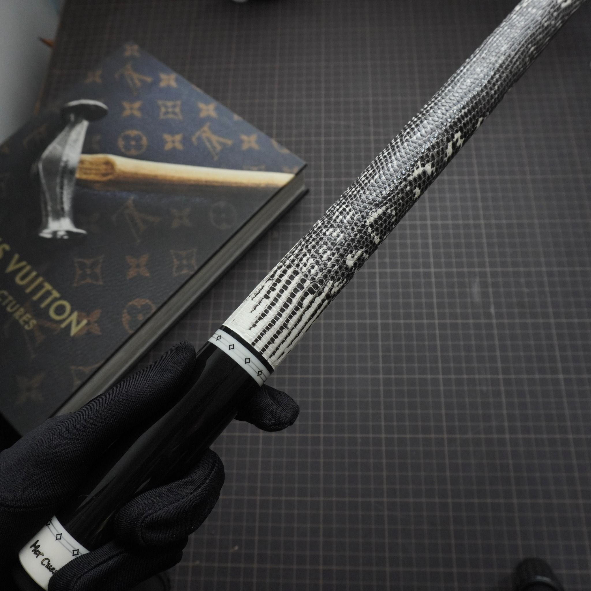 Bọc cơ da kì đà màu trắng đen cho chuôi MIT với những chiếc hoa văn tự nhiên tạo nên phần độc lạ và nét quyến rũ của các cơ thủ