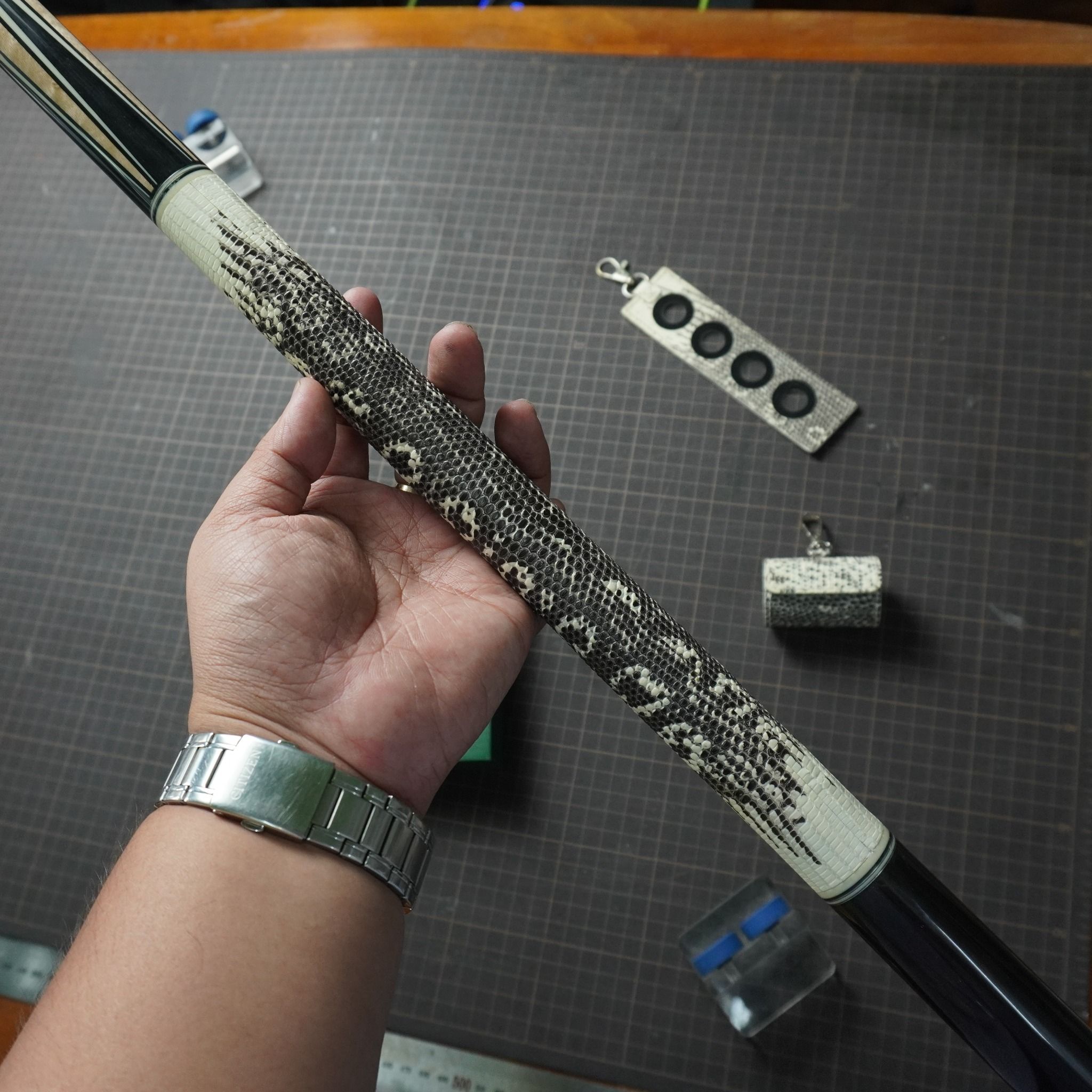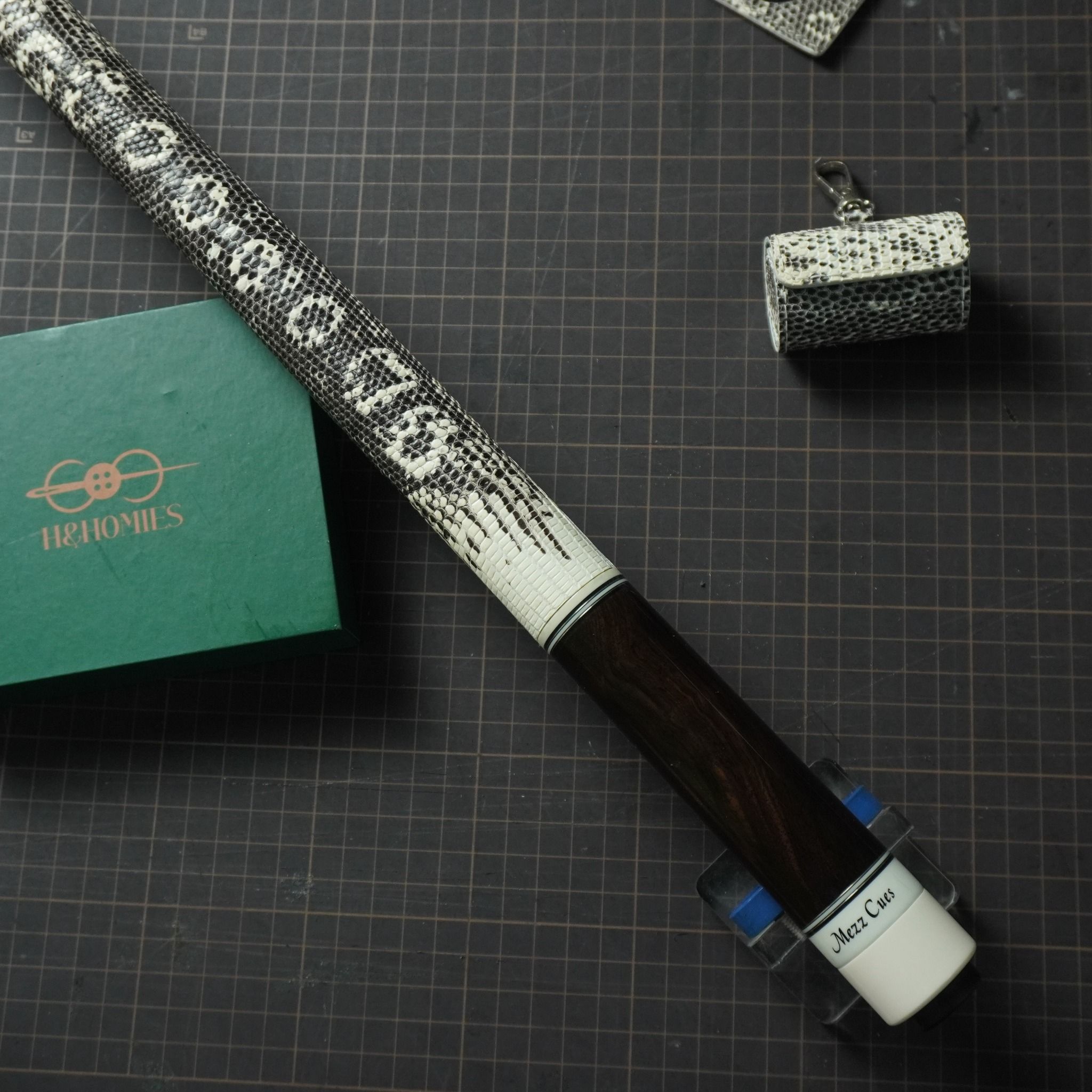 Bọc cơ da kỳ đà hoa trắng đen cho chuôi Mezz, với chất da kỳ đà hoa thể hiện sự huyền bí