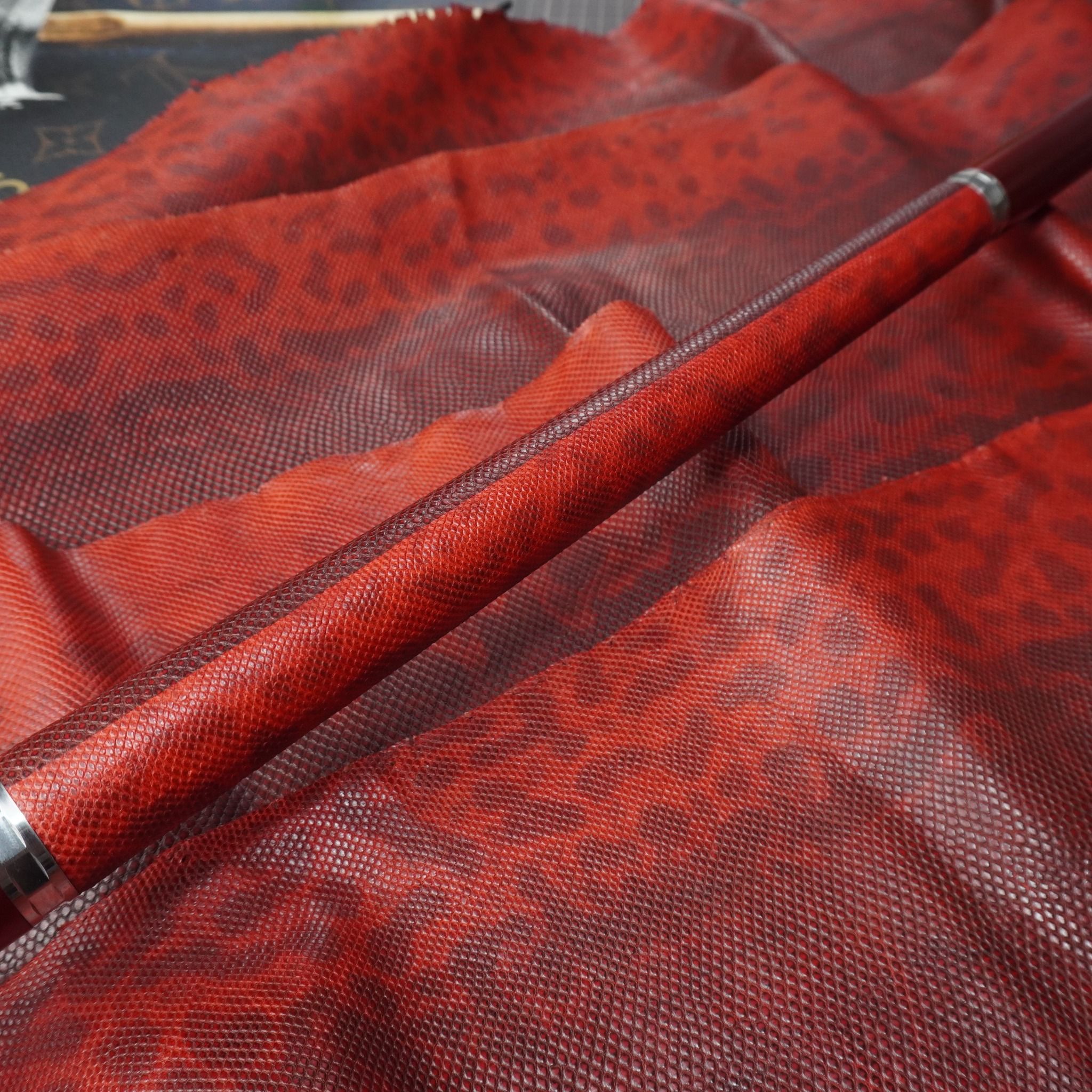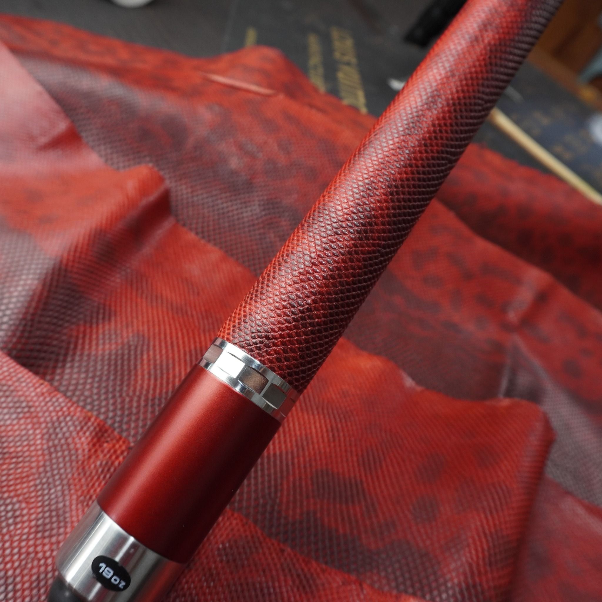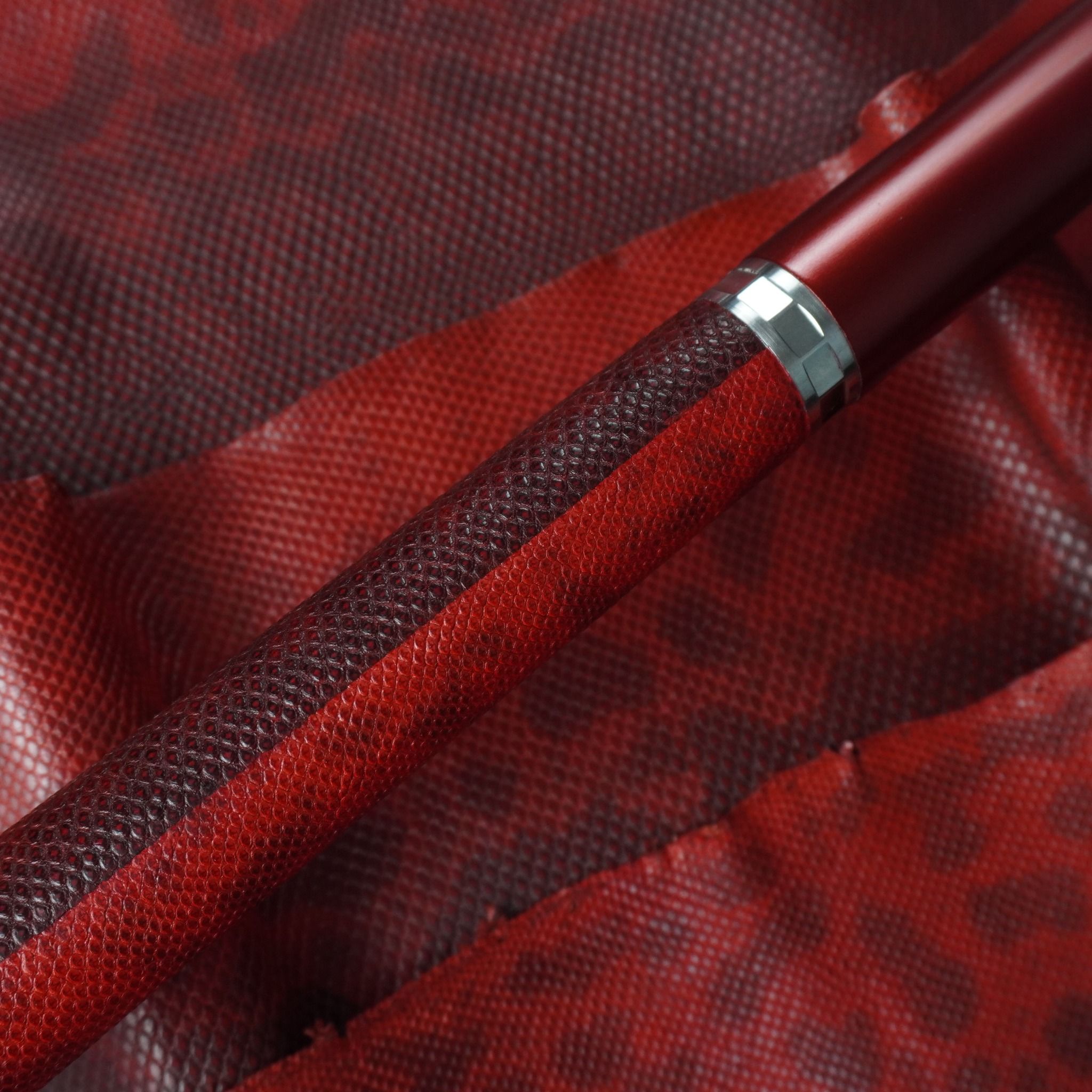 Bọc cơ da rắn Karung màu đỏ đô cho chuôi Custom, với chất da Karung được gia công thủ công thành thạo từ da rắn với vẻ đẹp lạ kì, để lại một ấn tượng không thê nào quên
