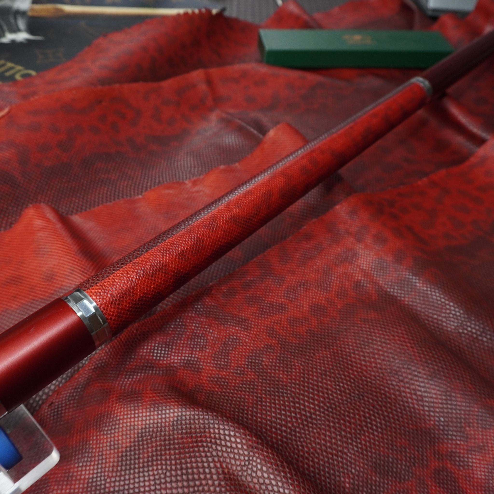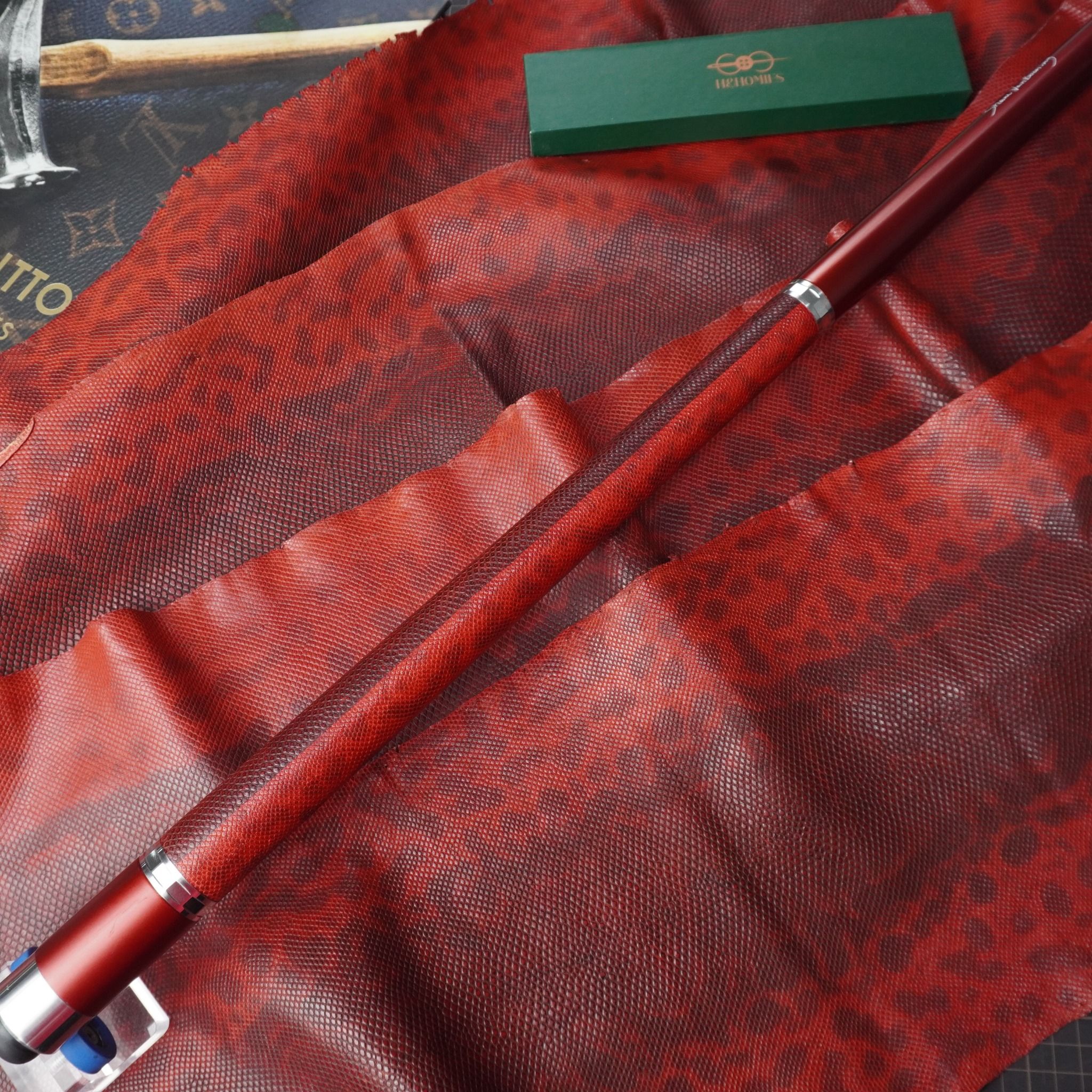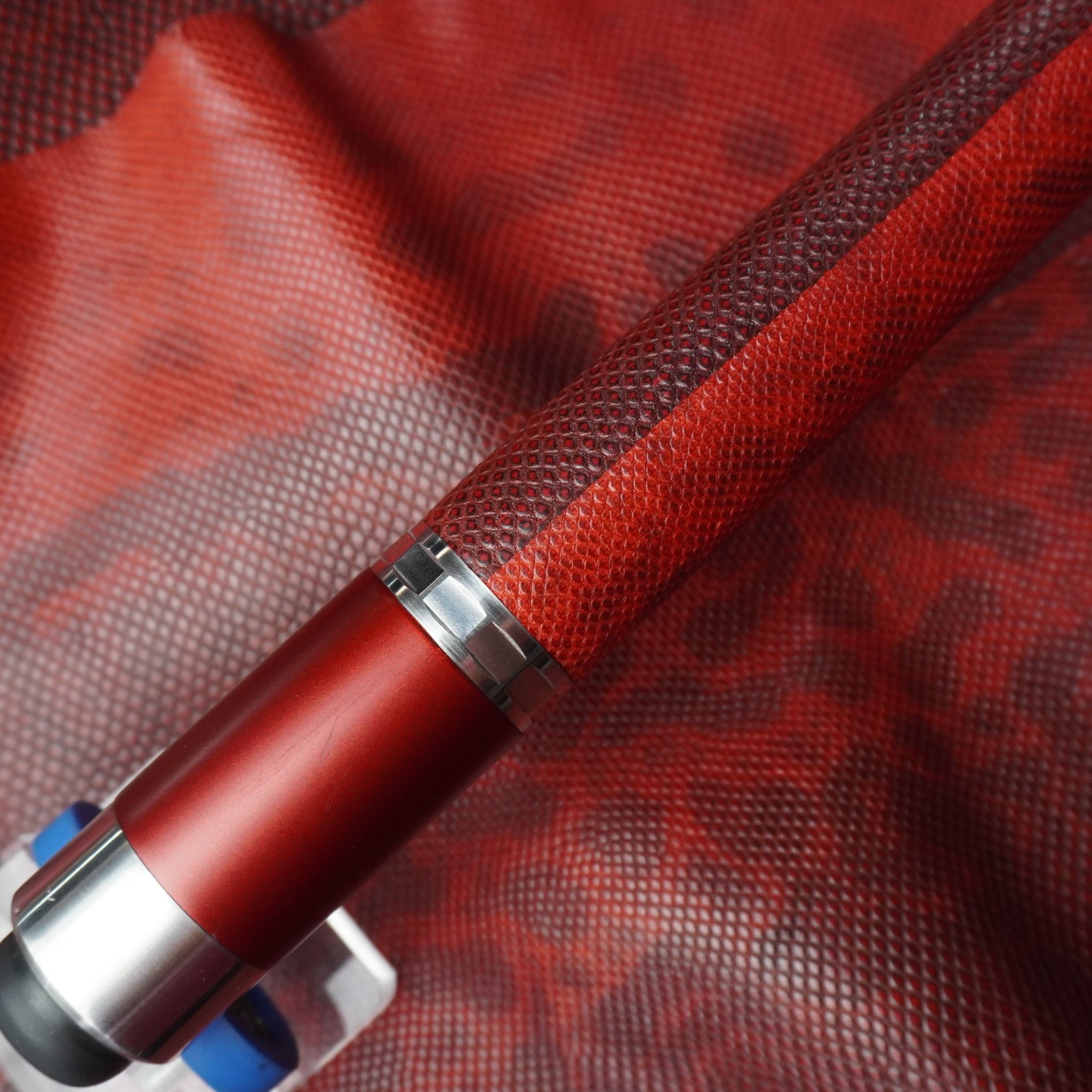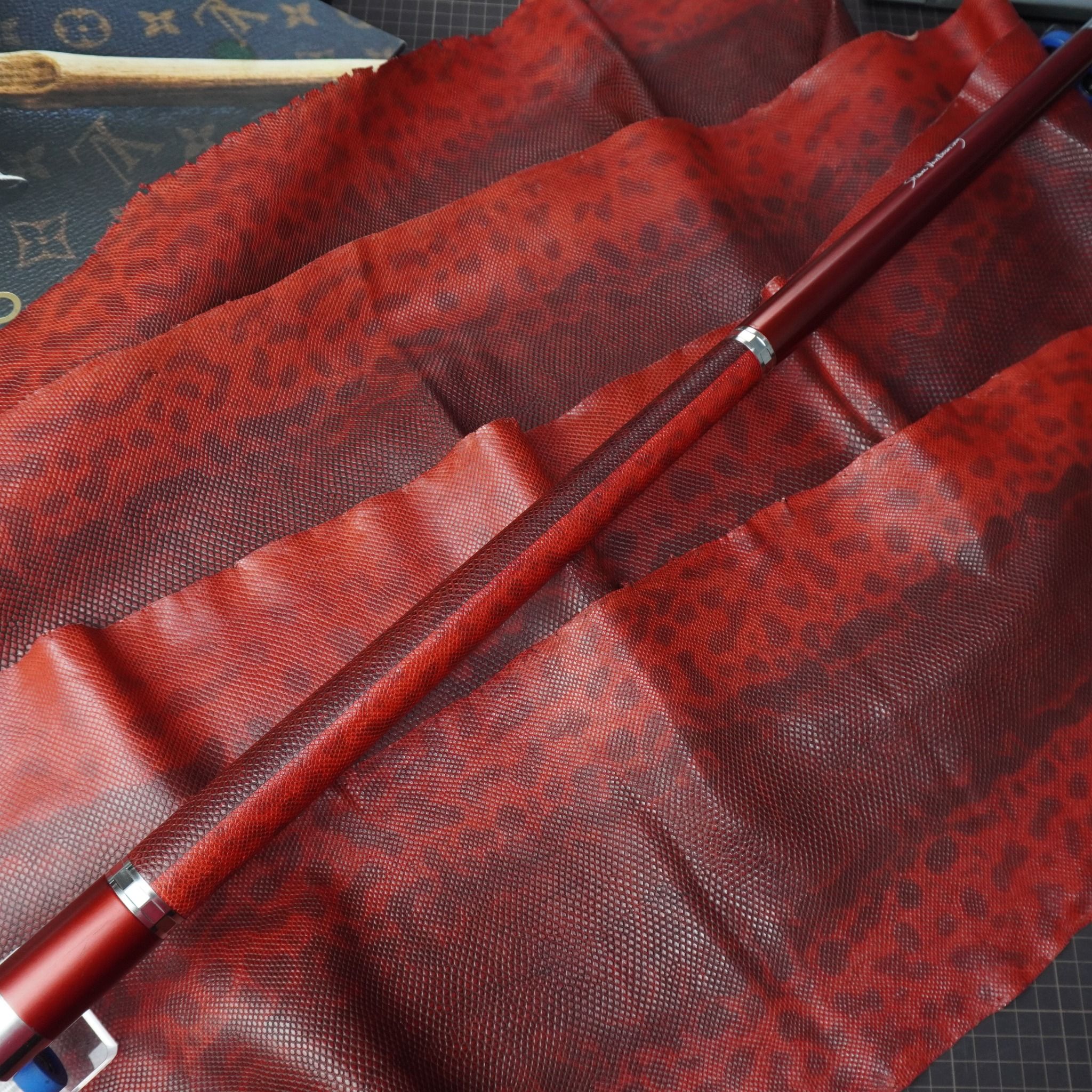 Bọc cơ da rắn Karung màu đỏ đô cho chuôi Custom, với chất da Karung được gia công thủ công thành thạo từ da rắn với vẻ đẹp lạ kì, để lại một ấn tượng không thê nào quên