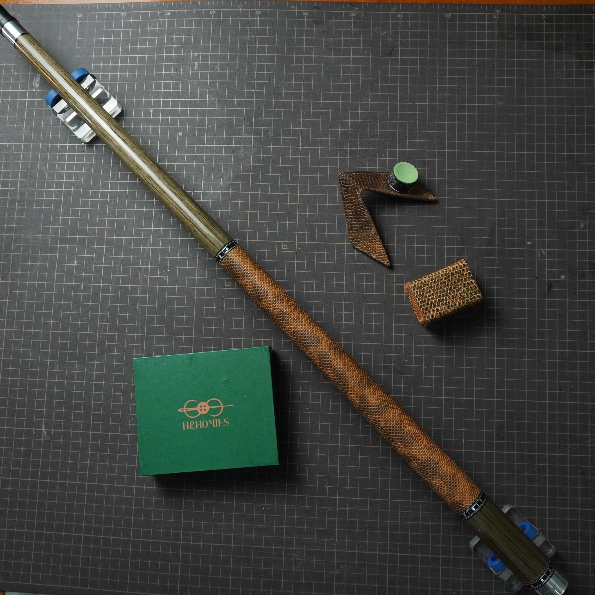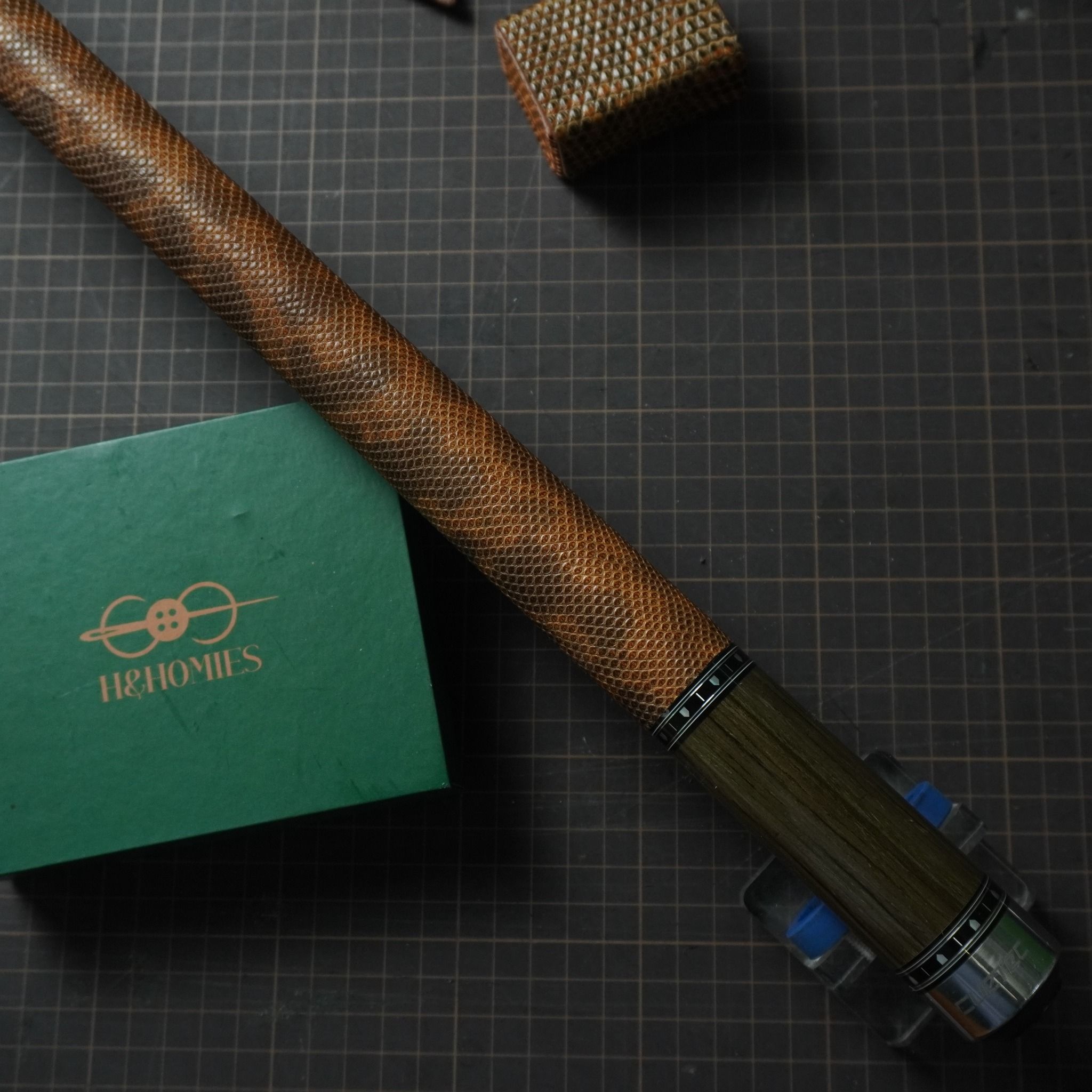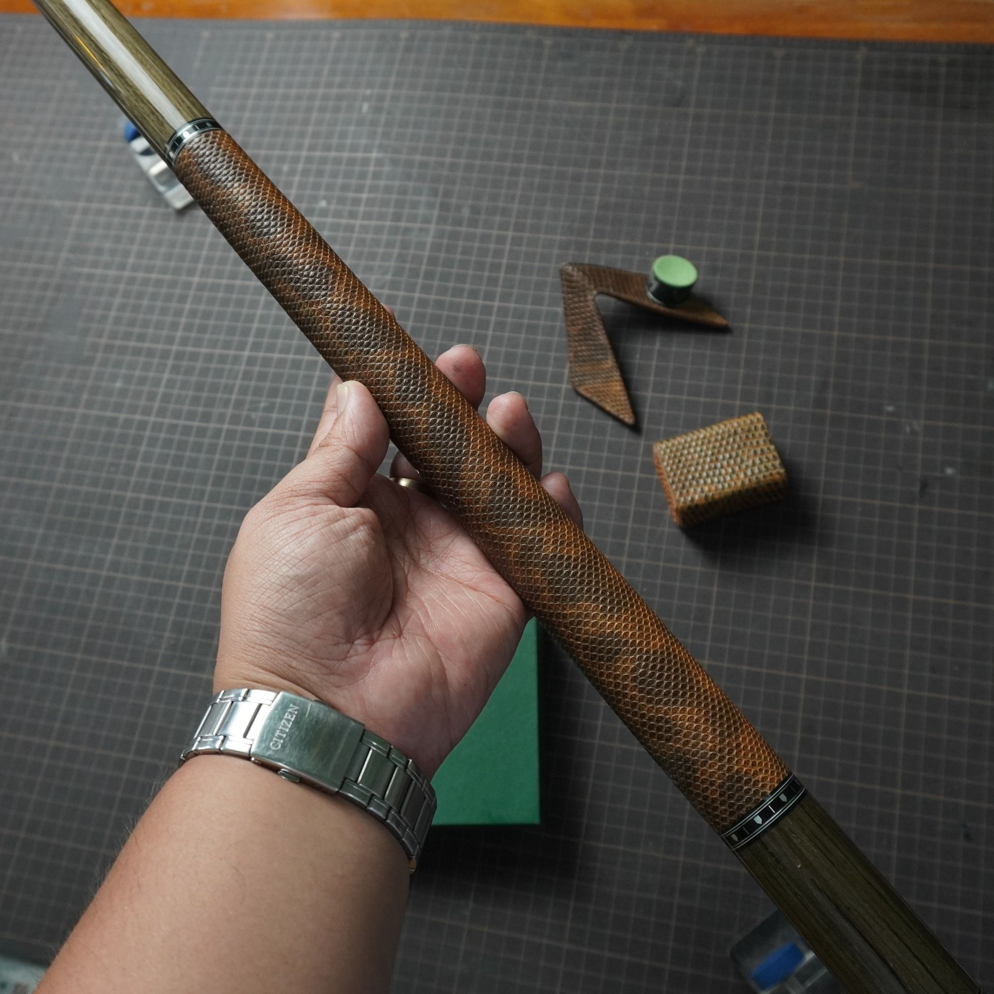 Bọc cơ da rắn Karung màu nâucho chuôi Cuetec, với chất da Karung được gia công thủ công thành thạo từ da rắn với vẻ đẹp lạ kì, để lại một ấn tượng không thê nào quên