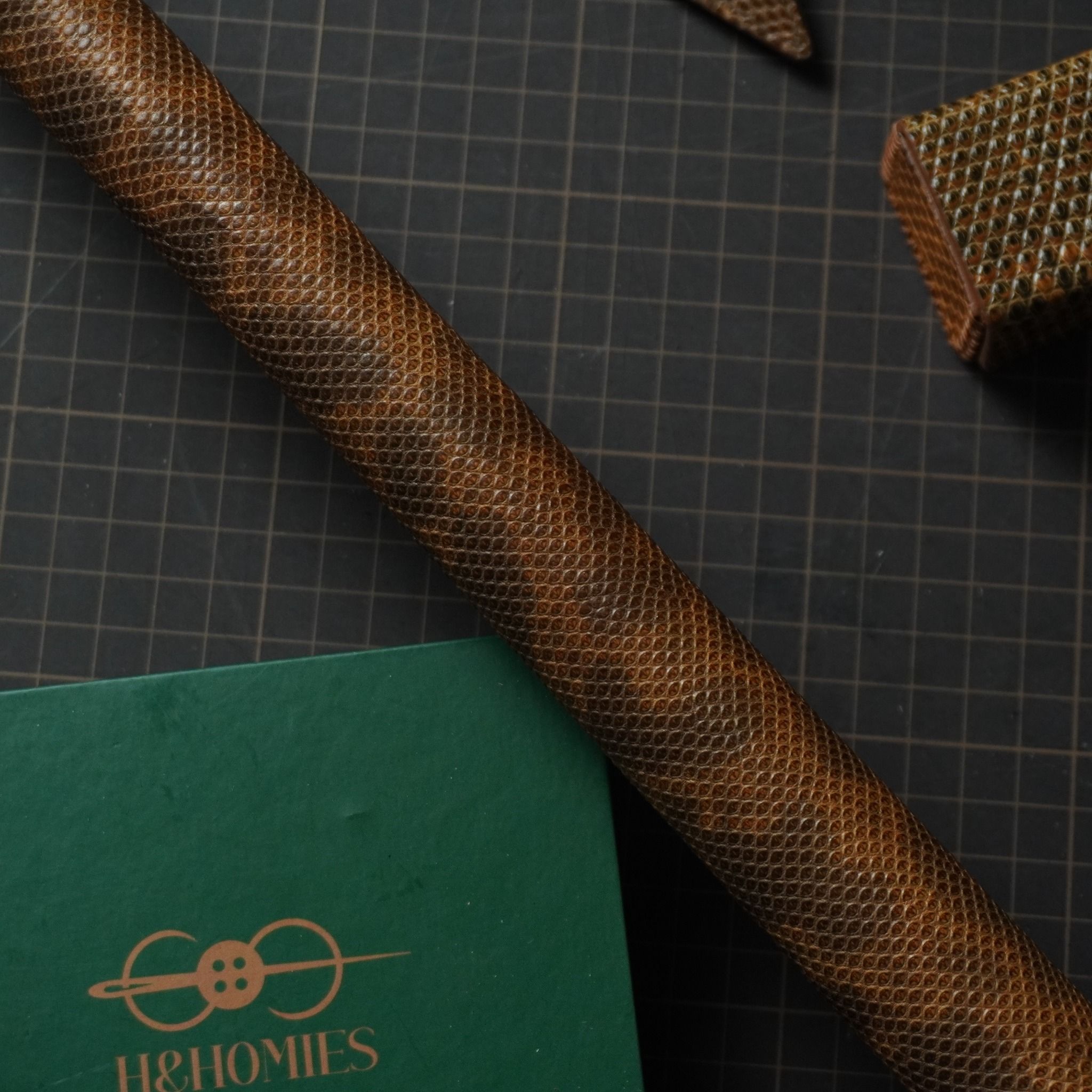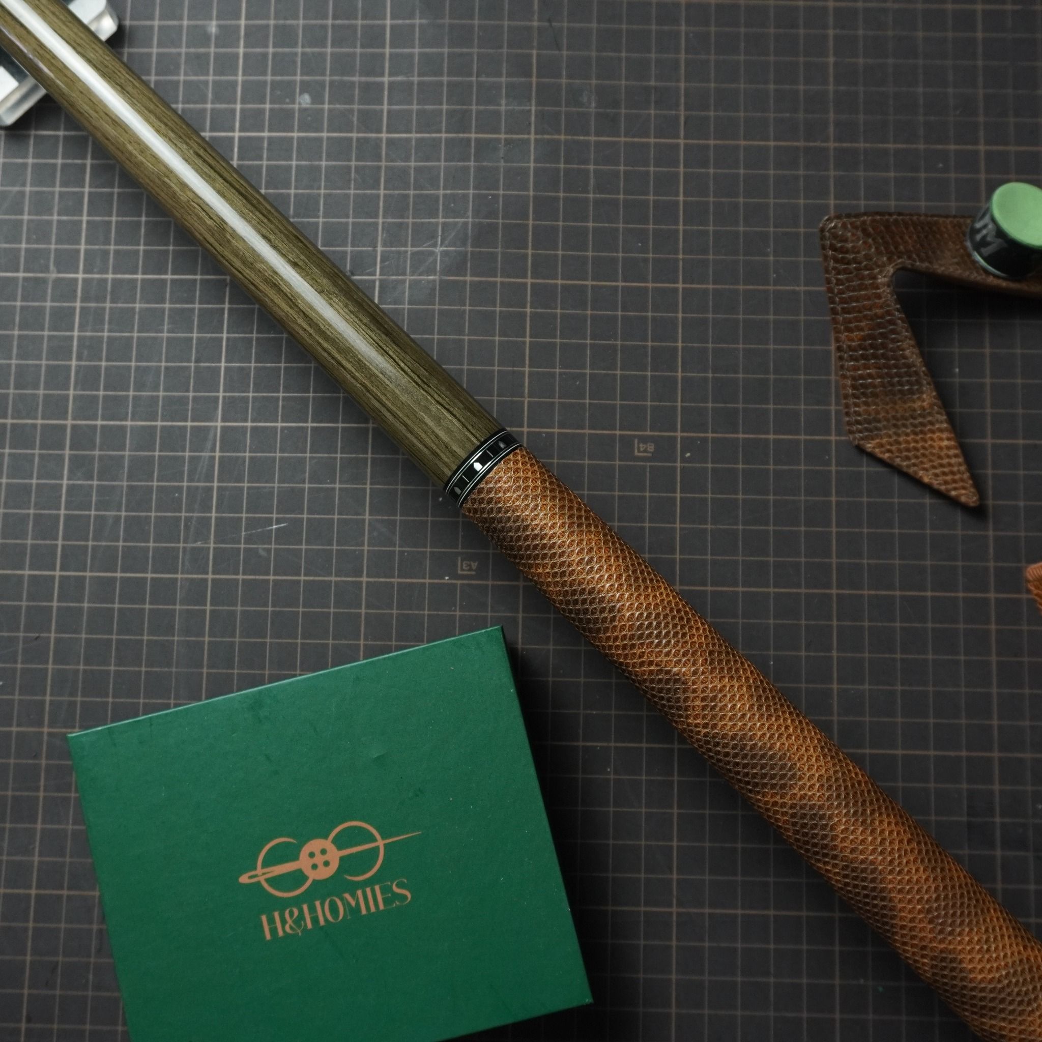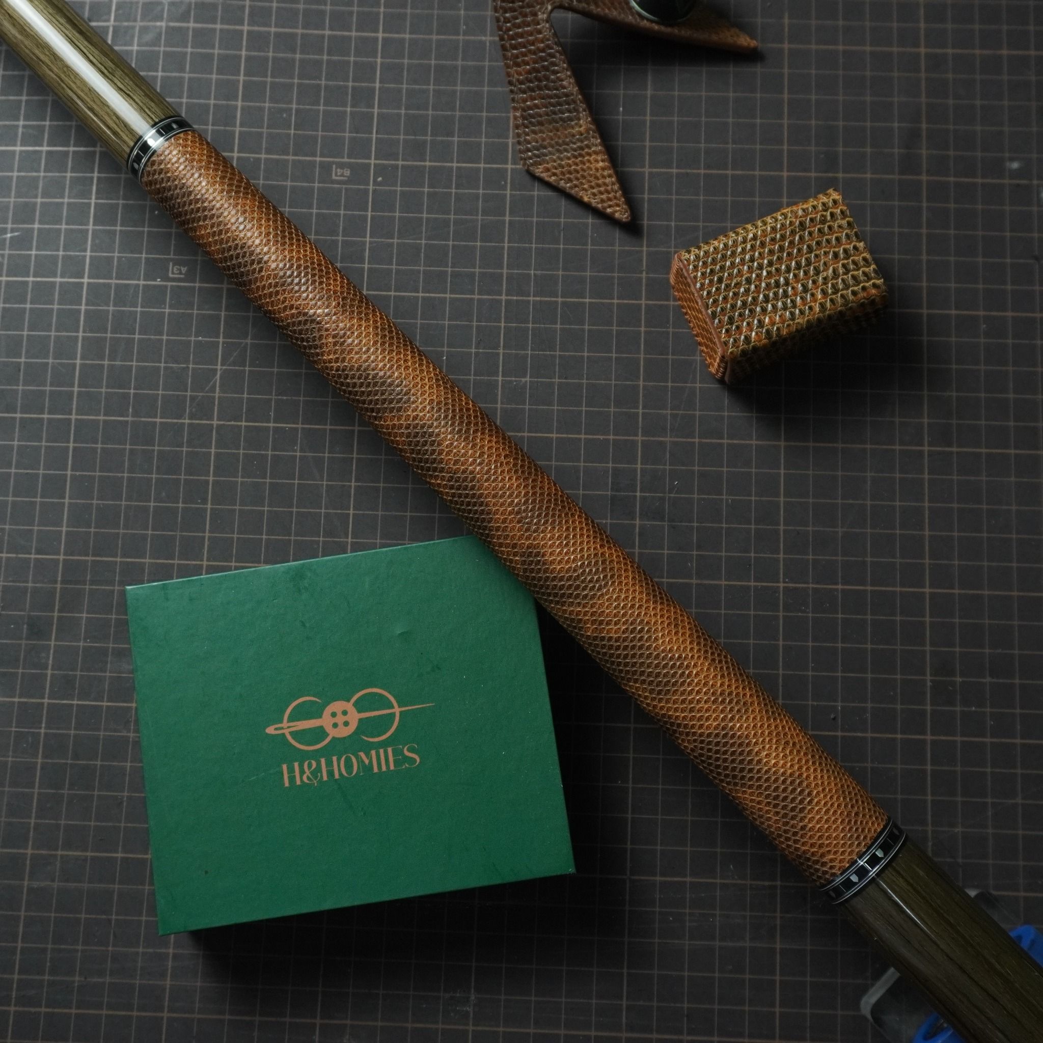 Bọc cơ da rắn Karung màu nâucho chuôi Cuetec, với chất da Karung được gia công thủ công thành thạo từ da rắn với vẻ đẹp lạ kì, để lại một ấn tượng không thê nào quên